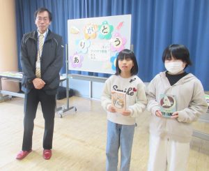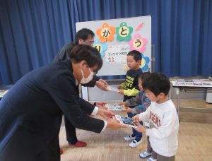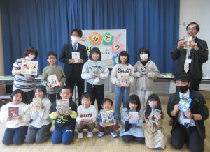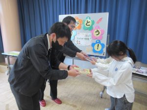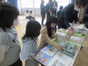 ブックオフ福島南店様よりこども達の好み本を1冊ずつ手渡され、とても喜んでいました。手渡していただいた本をこども達は夢中に読んでいました。