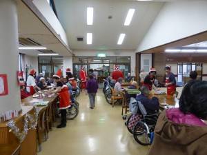 職員がサンタクロースに扮し、ひと足はやいクリスマス会をひらきました。
