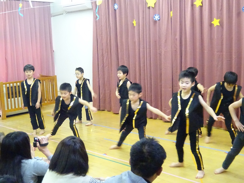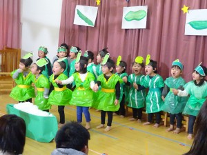 第二部は、ぽぷら組のメロディーベルの演奏で始まり、いちょう組の「そらまめくんのベッド」の劇やけやき組の「キュウレンジャー」のダンス、ぽぷら組は絵本「おばあさんのねこになったねこ」の劇などを発表しました。